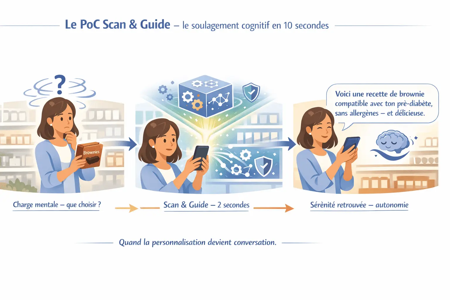 SafEats élimine la charge mentale alimentaire – un stress chronique invisible. Aujourd’hui par scan, demain par voix, texte, et conversation intelligente.