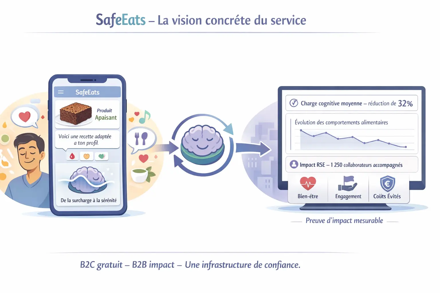 SafEats est gratuit pour les utilisateurs finaux (patients, aidants, grand public). Ce sont les mutuelles, les assureurs et les entreprises qui financent le service – en échange de dashboards d’impact, de données anonymisées, et de reporting RSE.
